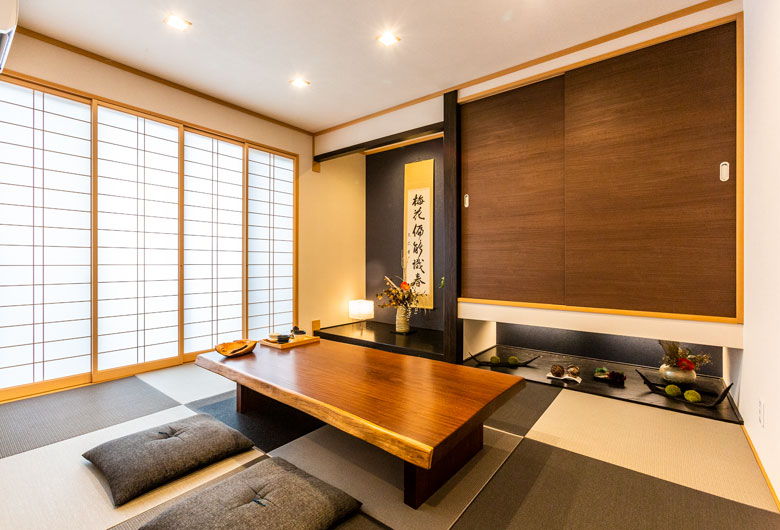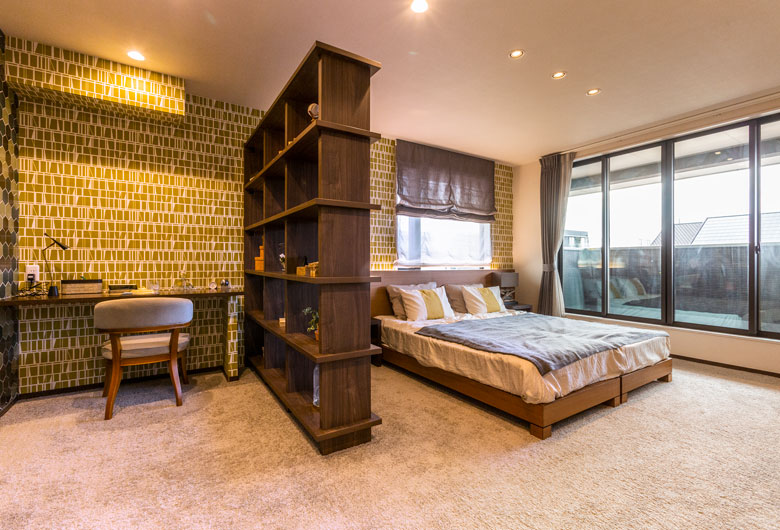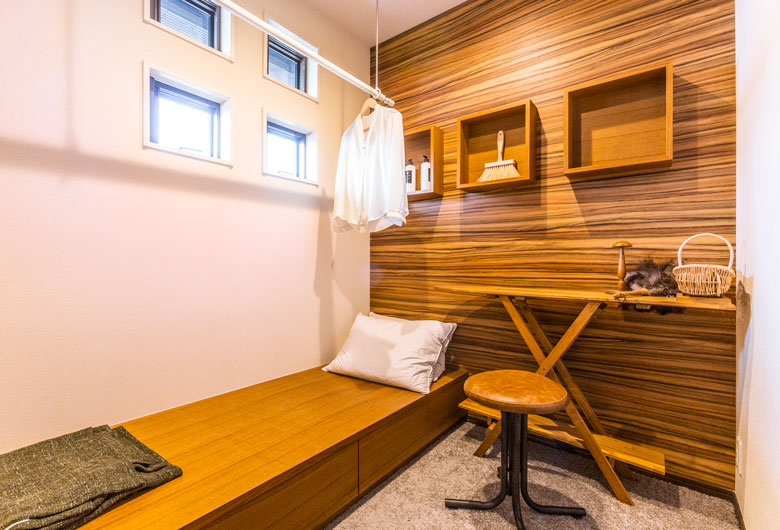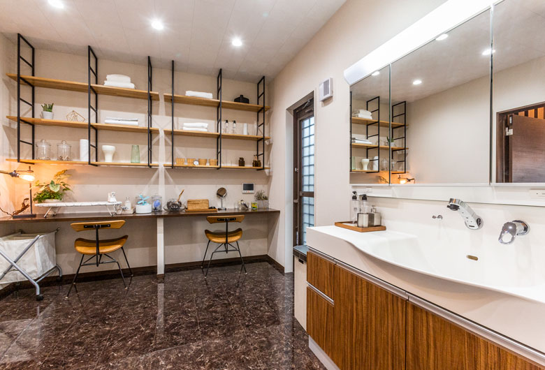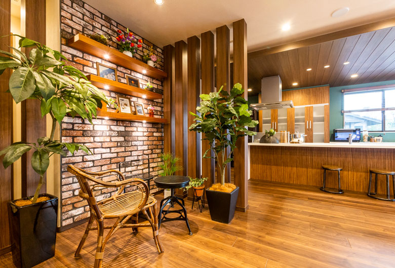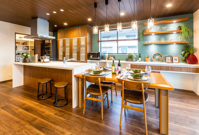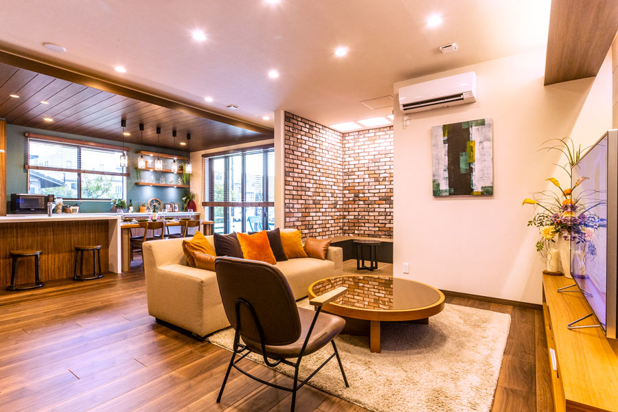 重厚感のある外壁タイルと、屋根勾配を低くし水平ラインを強調した外観、内装はリゾート感を漂わせるタイル貼りやクロスを基調に、落ち着いた上質な空間になっております。1階の水廻りはもちろんの事、2階の収納に至るまで、家事動線を配慮した設計です。光や風を取り込んだ家族の集まる空間をご提案しております。
