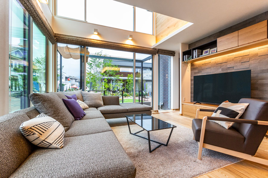 □大開口サッシ・吹抜けを使用した開放感あるLDK