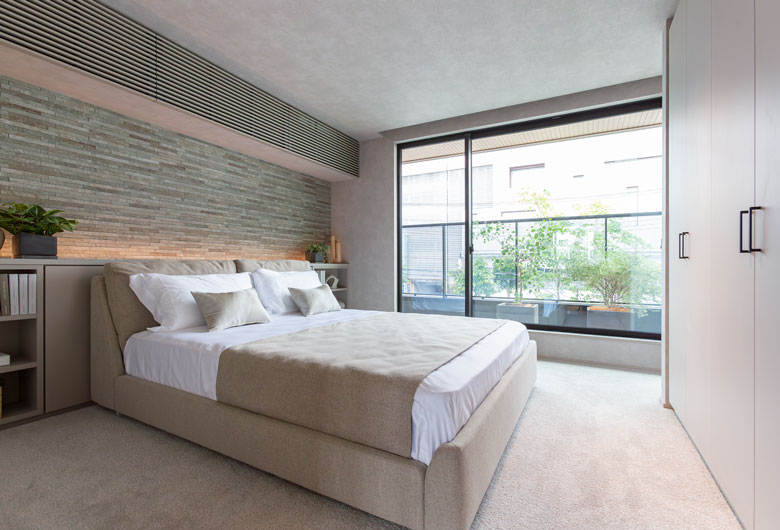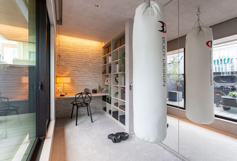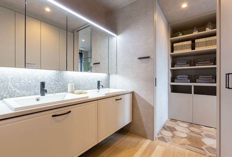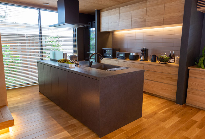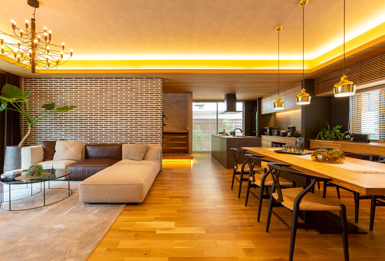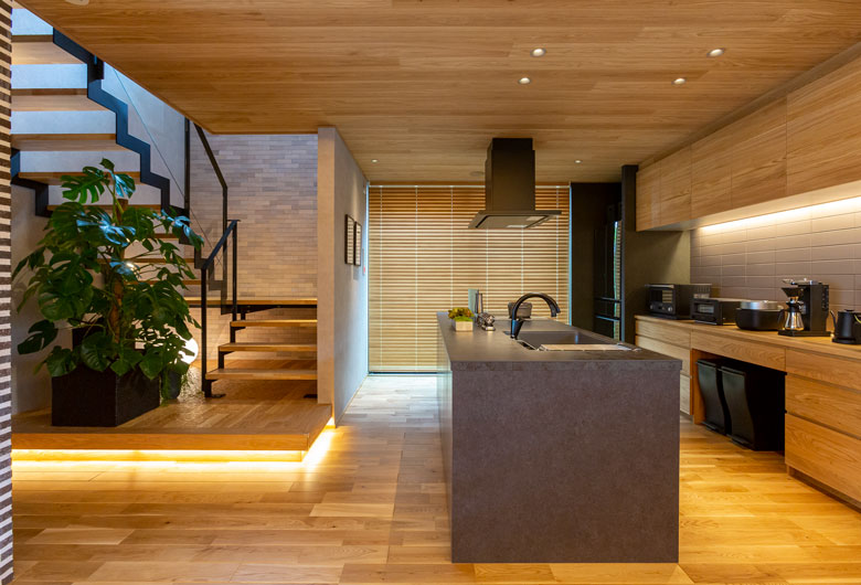 寄棟型のおおらかな屋根にオーバーハングと庇を効果的に設け、太陽の日射をコントロール。四季を通じて光と風を採り込み、豊かな緑を日常生活で感じられる、木のぬくもりにつつまれた家です。外装材では耐久性の高い部材も採用、内装材にはグレージュを採用し、高級感の中にも柔らかさを持ち合わせた大空間となっております。