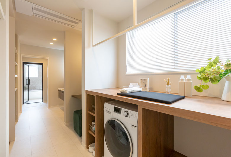 アイ工務店は、高水準な断熱性能を実現させ、時代を先取りした省エネ住宅を標準仕様としていながら、自由度の高い設計が実現可能です。古河展示場では、畳コーナーを併設したLDKは、開放的でありながら、天井の高さや設えに変化を持たせ、メリハリのある空間になっています。また、キッチン近くにあるランドリーと洗面&ファミリークロークの効率のよい動線など、暮らしやすさを感じさせる提案も見どころです。階段下に配した土間収納や、ハーフ収納、スキップフロア小屋裏収納など、縦空間の活用例も充実しています。