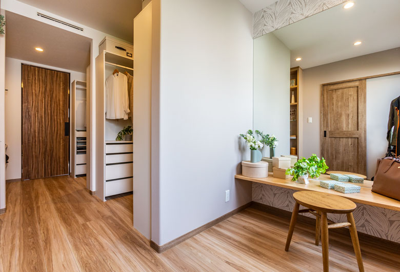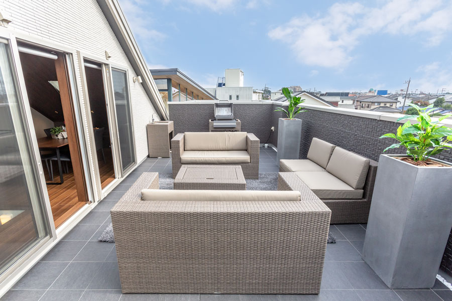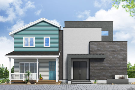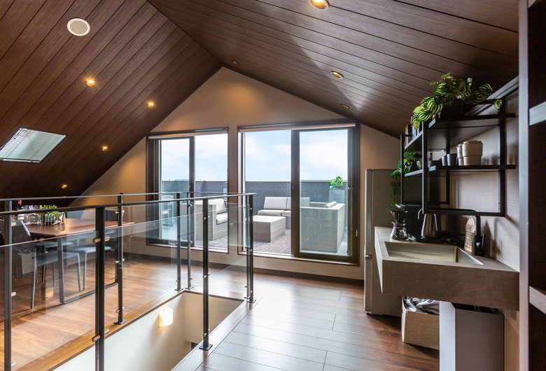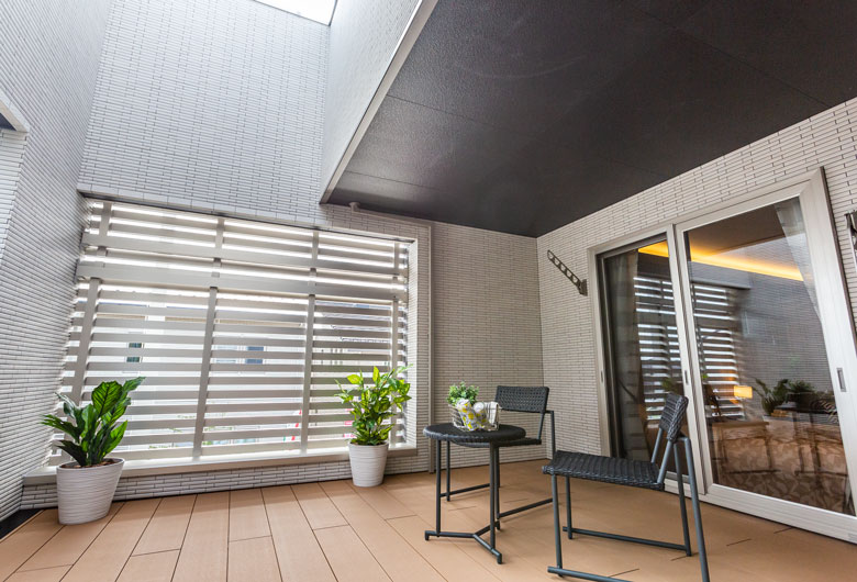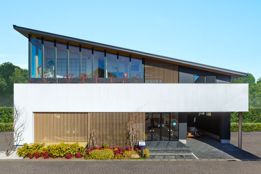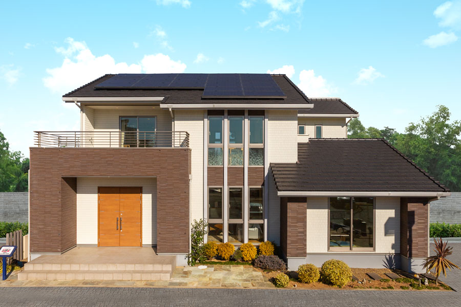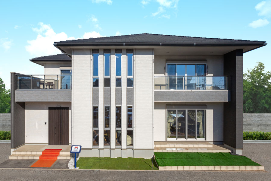 横格子が印象の都会的な外観。家中快適な「Z空調」だからこそ実現したLDKからも玄関からも回遊できる充実した家事動線、家族みんなで共有できるファミリークローゼットが特徴。開放的な空間とプライバシーを確保したインナーバルコニーと屋上庭園で家族や友人との時間を堪能できます。