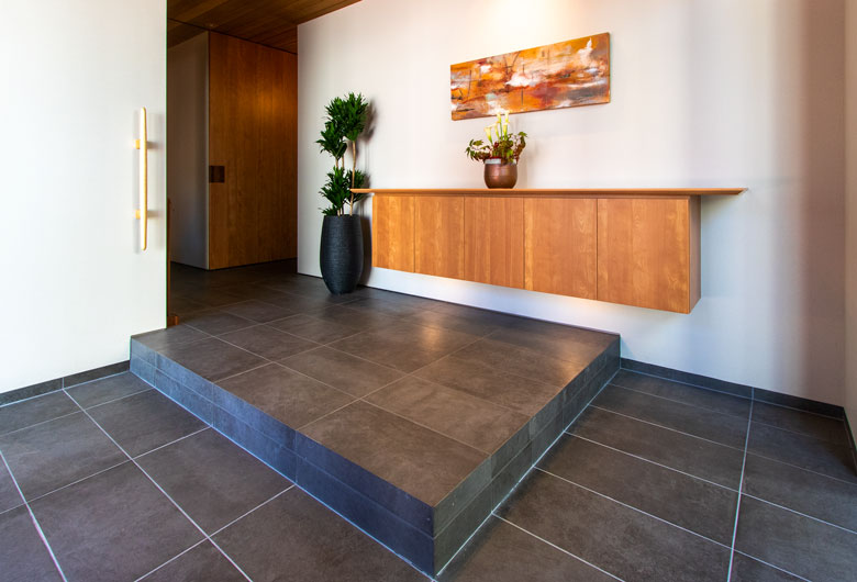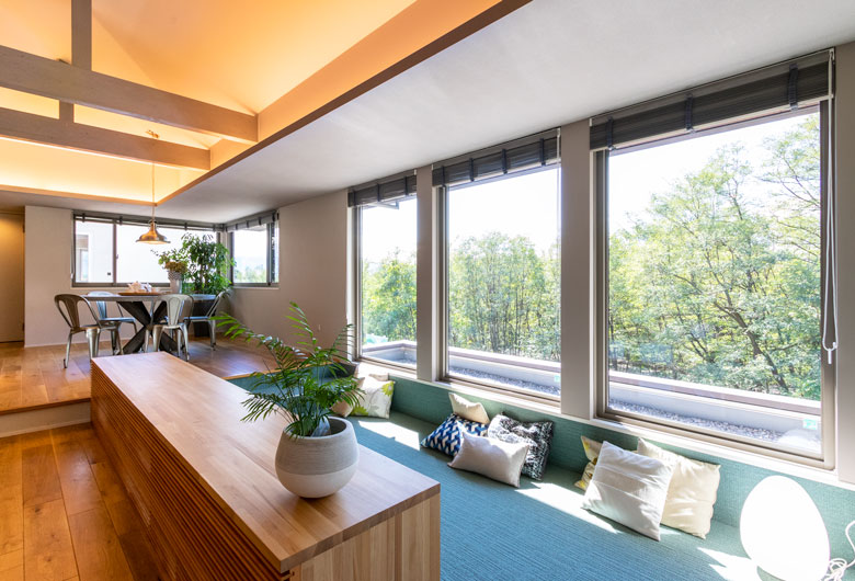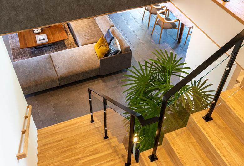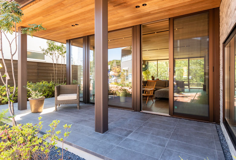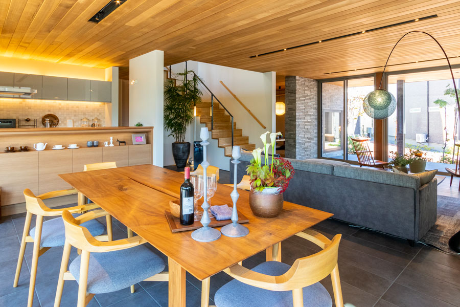 自然素材のぬくもりと、ダイナミックな空間を楽しむ木の住まいです。天井高のサッシと室内外の床・天井面をフラットに揃えた美しい「クリアビューデザイン」は、軒下の半屋外空間を介し外と内を緩やかにつなげます。室内にいながら庭や空、その先にある風景まで一体となります。