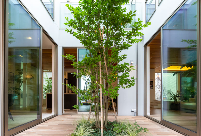 目線を隠し、上から降り注ぐ光を取り入れるプライベートパティオ