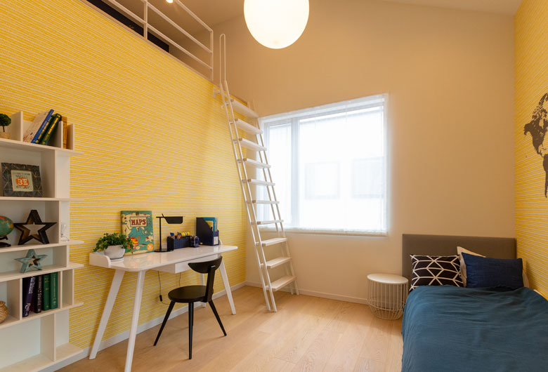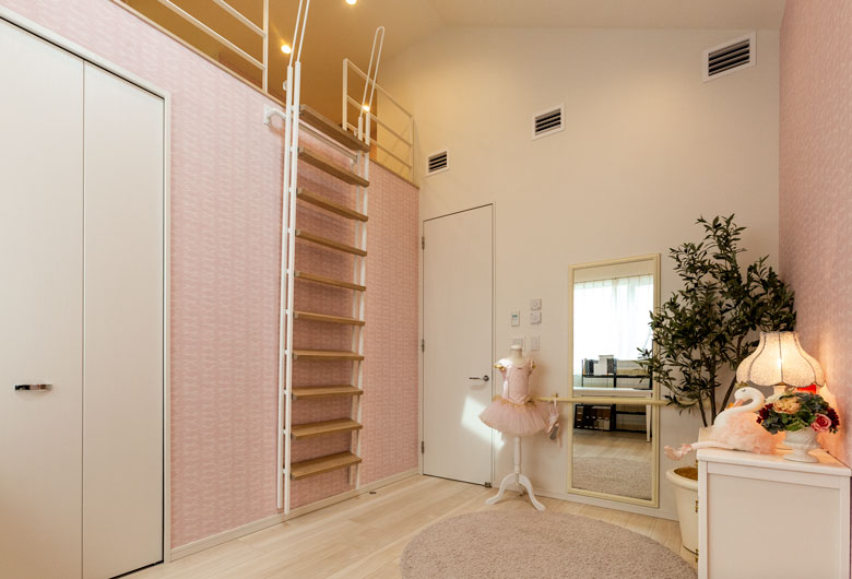広がりのある室内空間を演出する、勾配天井とロフト