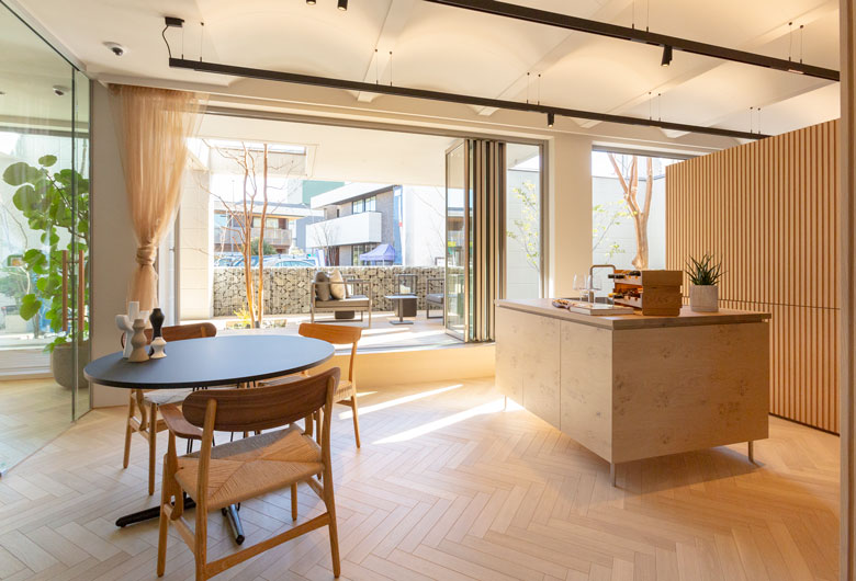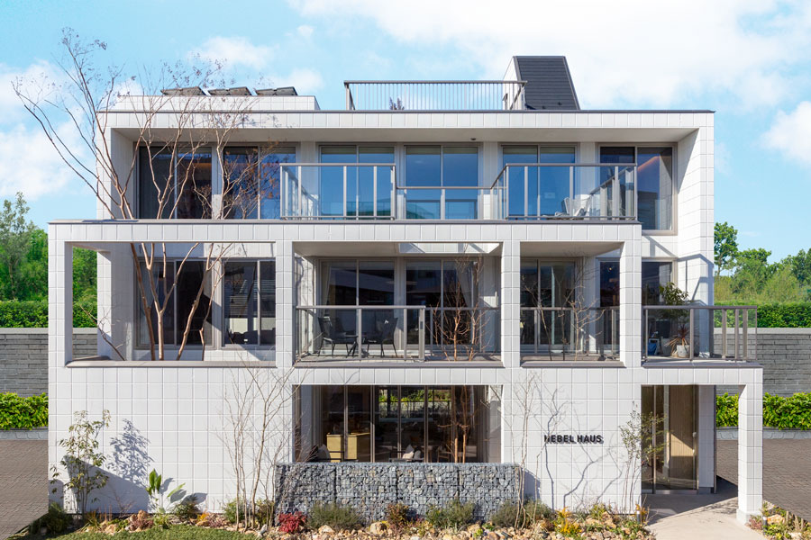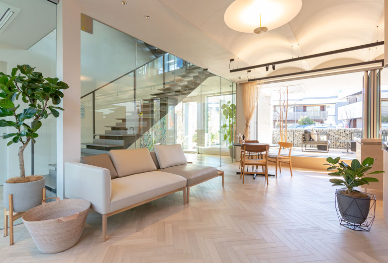 「東京デザインオフィス」が手掛ける、世田谷区唯一の住宅展示場です。シンプルな躯体から鮮やかな緑が覗く、邸宅に相応しいたたずまい。木のぬくもりを感じる「VILLA STYLE」、大人のラグジュアリーを表現した「Urban Luxe」のインテリアスタイルで仕上げた内部には、波打つデザインの高天井や、ガラスの壁、アートなど、心豊かな生活を愉しむ為の工夫が施されています。ダイナミックな構造躯体だからこそ実現できる、大空間、大開口。大きな吹き抜けから覗く緑が、気持ちを穏やかに整えます。ヘーベルハウスでつくる「邸宅」のスタンダードを、ぜひご体感ください。