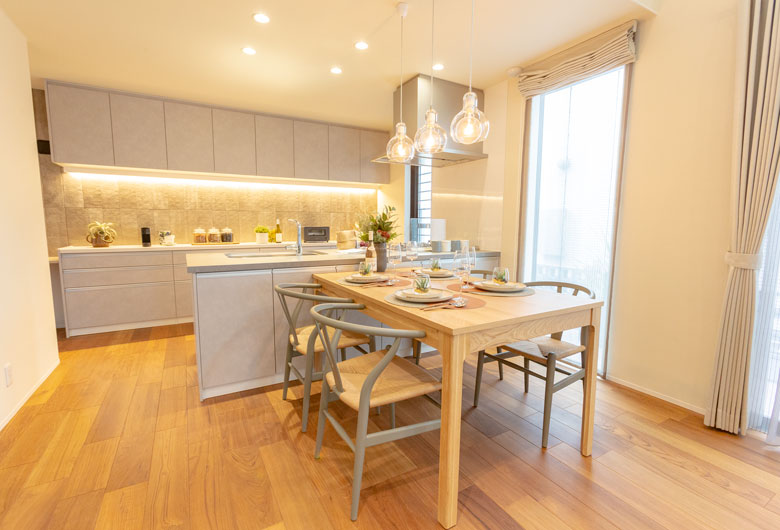 現実的なサイズでありながら、開放的なLDKや家事ラクな周遊動線に加え、ご要望の多いスキップフロアや家事コーナーなどを採用しています。また、セラミックトップのキッチンをはじめとする標準設備の充実ぶりも評判です!