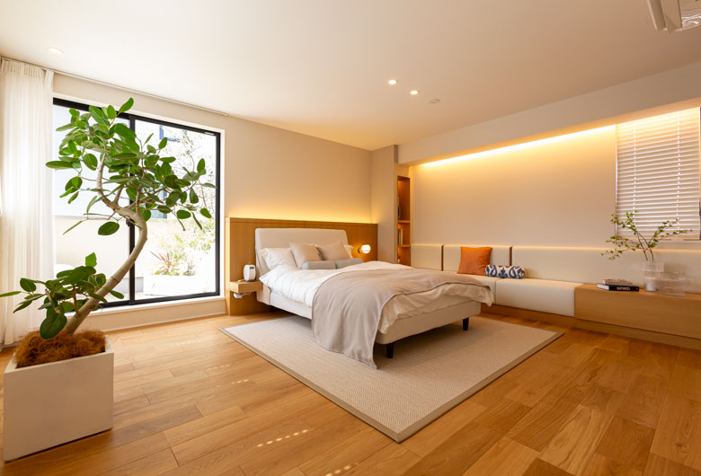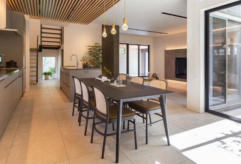 軒の出を深くした和モダンテイストの外観と、庭屋一如(ていおくいちにょ)をコンセプトとした、ウチはソト、ソトはウチという庭と建物とが一つのごとく融合した、調和のとれた間取りとなります。また雨の日の出入りも便利なビルトインガレージを採用し、お車好きの方がリビングから愛車を眺めて優雅なひと時を満喫することができる、憧れのスペースを実現いたしました。ハウスメーカー屈指の耐震性能と、断熱等級7の最高等級を実現可能なxevo GranWoodをぜひ目の当たりにしてください。