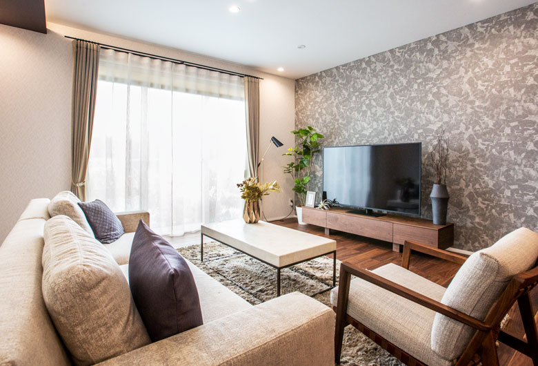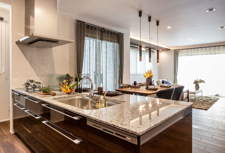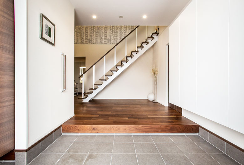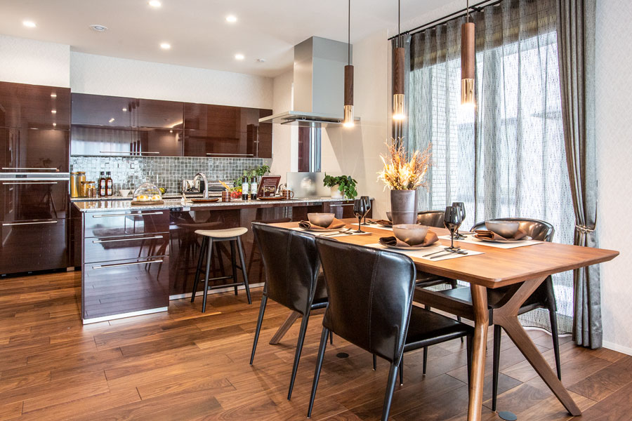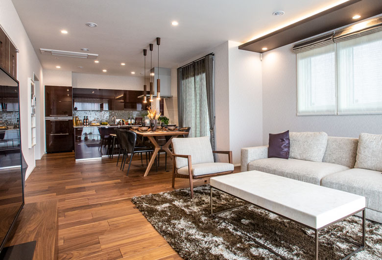 外壁にはメンテナンス面に優れたタイルを全面に使用。1階と2階で全く雰囲気が違う室内には鏡面塗装されたオリジナルキッチンが目を引き高級感をプラス。『超省エネ・超健康』住宅と謳う一条の性能の高さをご案内致します。