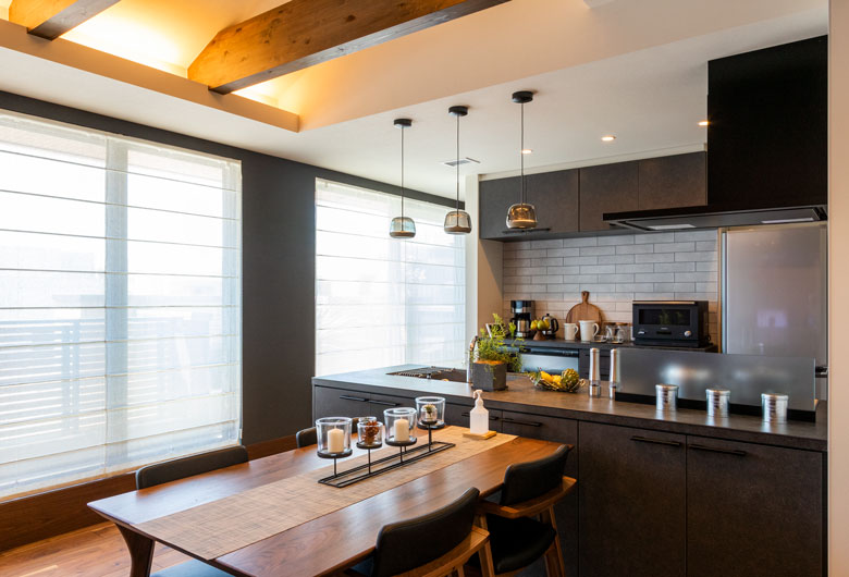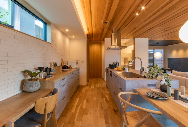 開放的で木質感溢れる上下分離二世帯住宅のモデルハウスです。1階と2階でそれぞれ異なるコンセプトでデザインしておりますので、1棟で二種類のキッチン等の設備部材・内装の雰囲気をお楽しみいただくことができます。面倒な家事が楽になる生活動線・収納提案もご好評いただいており、きっとお住まいづくりの良いヒントになるのかと思います。一般的な木造住宅では実現することの出来なかった、高いレベルでの耐震強度を保ちつつ、ダイナミックな空間を実現出来ている点も見どころです。ぜひ一度ご体感いただければ幸いです。