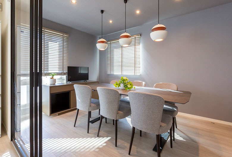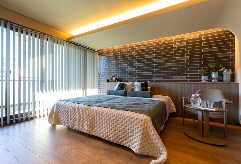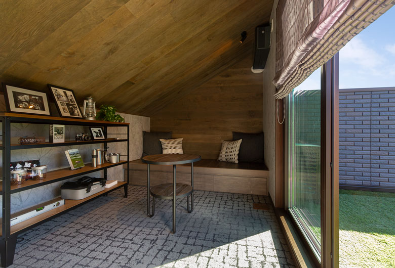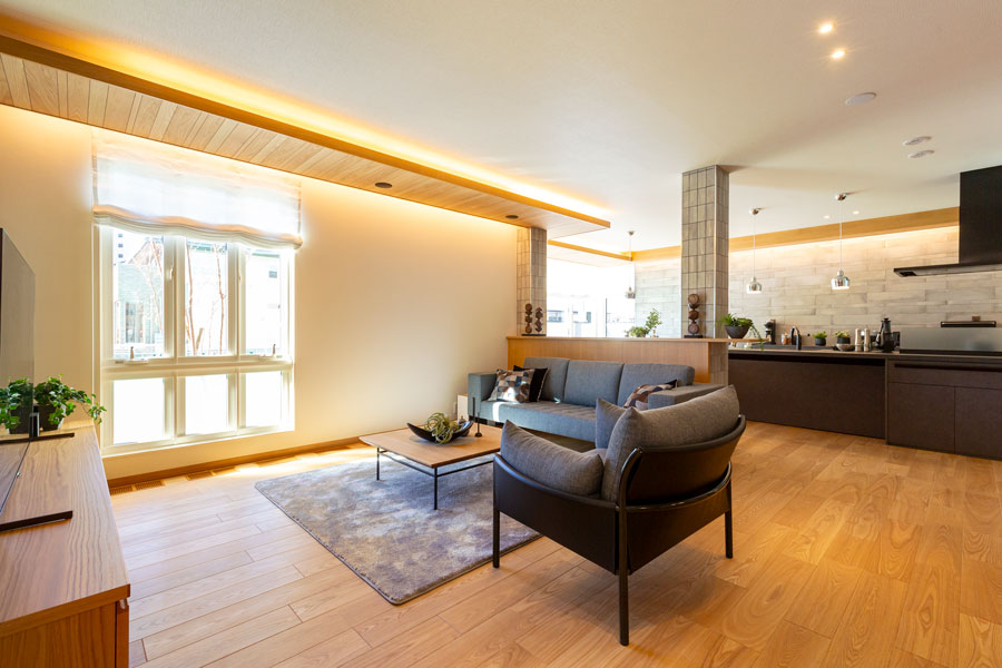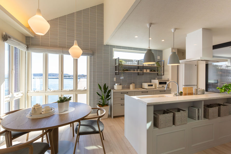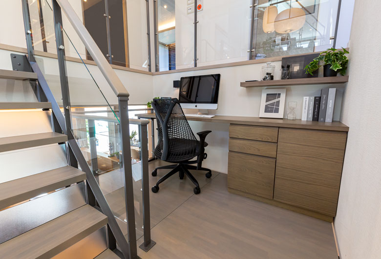 リラックスした雰囲気をもたらす間接照明が印象的なリビング空間、大開口のダイニングキッチンなどゆったりとした空間を演出する1F世帯、コンパクトながら吹き抜けを取り入れた開放的なダイニングキッチンが素敵な2F世帯、玄関の手洗い&2WAY動線・スキップフロアのワークスペース・大きな屋上バルコニーと繋がる小屋裏の隠れ家空間・包まれ感のある和室・東京湾や猿島が望める開口設計など見どころ満載のモデルルームです。階段部の吹き抜けを通じて2つの家族がつながる2世帯住宅。