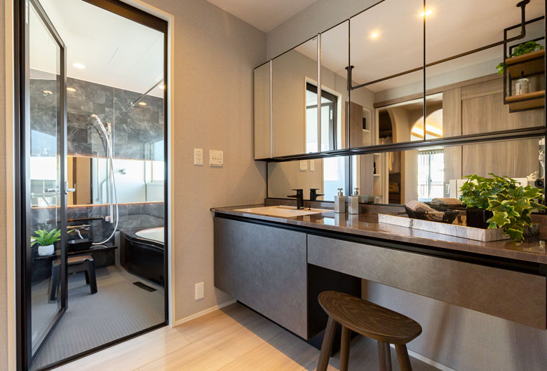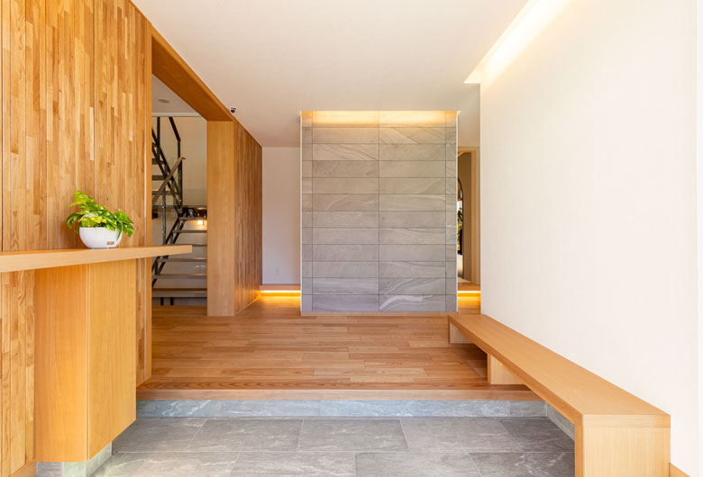 1Fは木とタイルでナチュラルモダンに、2Fはグレイッシュモダンの2世帯住宅です