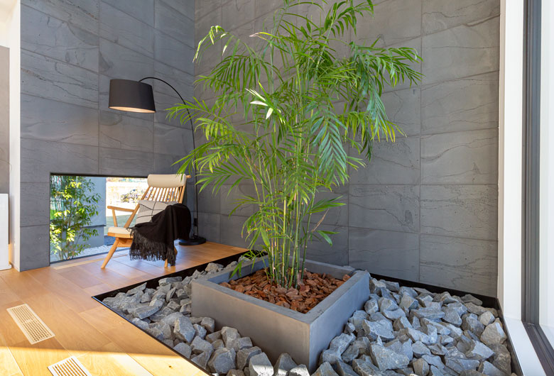 土間スペースに植栽を植え、壁は蓄熱体、日中日射を吸収して夜に熱を排出するタイルを使用しています。