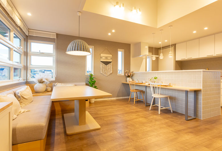 一年中、家中「暖差」の無い暮らしを実現する全室空調【快適エアリー】を搭載。更に、環境に配慮し光熱費負担と災害リスク〝ゼロ″を目指せる【スマートハイム】仕様を完備。1階は<オーセンティックモダン>テイストの木質をふんだんに楽しめる落ち着いたLDK、2階は<グレージュノルディック>テイストのやわらかな明るいトーンとナチュラルな雰囲気を楽しめるLDKとなっており、1つの展示場で2つのLDKを体感いただけます。その他、パントリー・ランドリールーム・W.I.Cなど、今の住まいの欲しいが詰まったプランです。