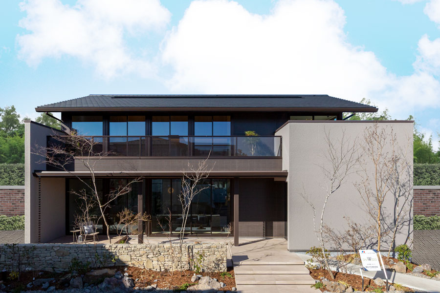 木造住宅で業界1番の構造強度を誇るシャーウッド構法だから出来る、約8Mの大開口の窓と大空間のリビング。その上部には、ダイナミックな吹抜けを設け、スキップフロアや木質感溢れる約46帖の勾配天井など、見所が詰め込められた単世帯住宅です。外壁にはオリジナル陶板外壁「ベルバーン」を採用いたしました。大屋根の軒、バルコニーの水平ラインを強調した外観です。ぜひご見学下さい。