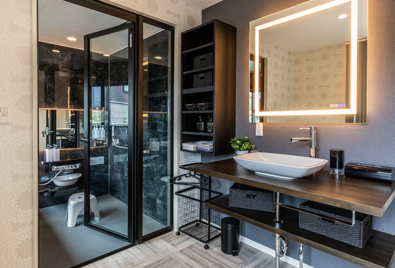 新しい生活様式に合わせたおうち時間を充実させる工夫を数多く取り入れました。家族みんなで囲めるアイランドキッチンや、シアタールームは家族にゆとりの時間を生み出します。ホテルライクに仕上げたサニタリーや、こだわりぬいたインテリアも魅⼒の1つ!玄関から入ってすぐ手洗いができる洗面スペースや、お子様が楽しく学べるキッズルームなど、子育て世帯のお家づくりのヒントになるポイントがたくさん詰まった展示場です。