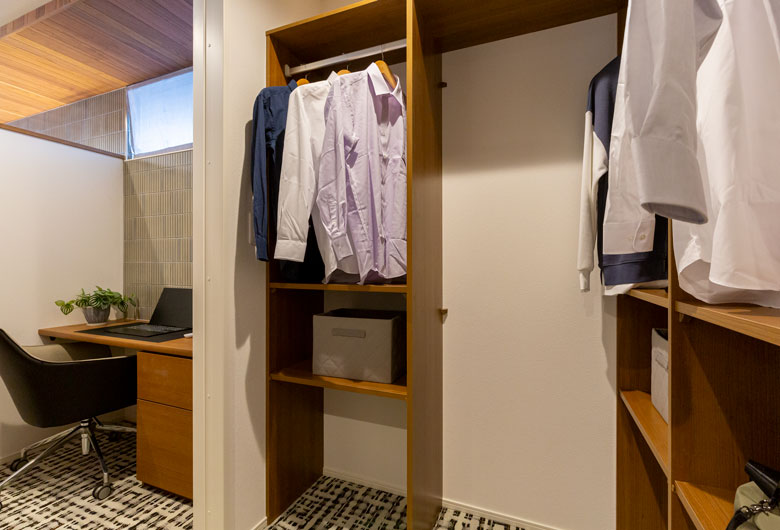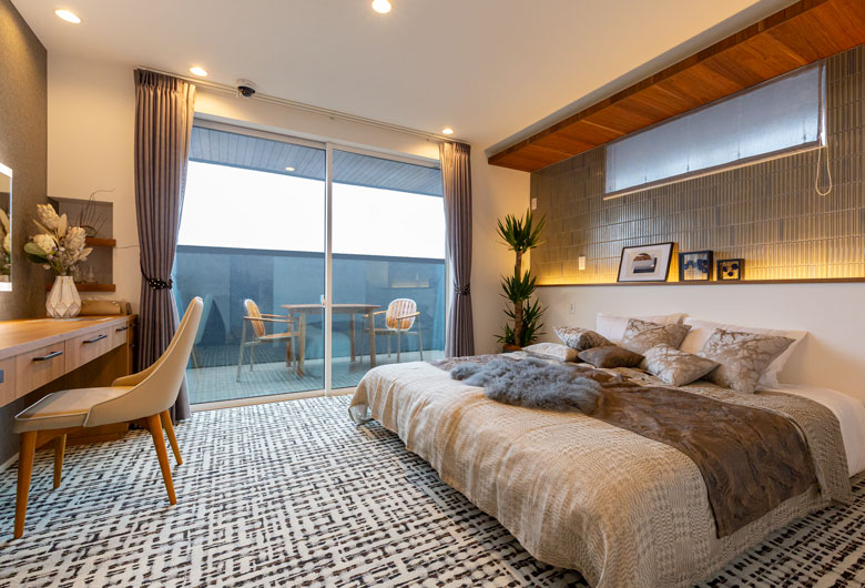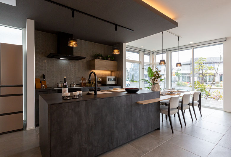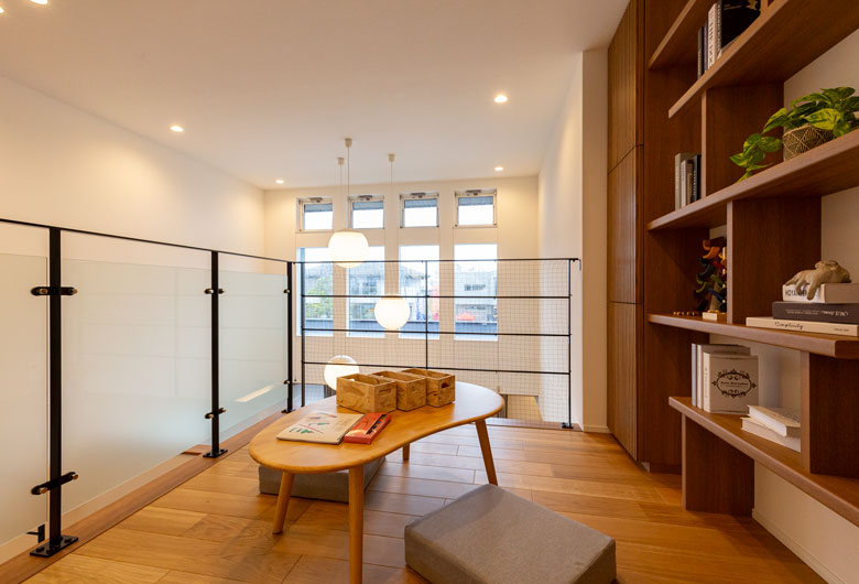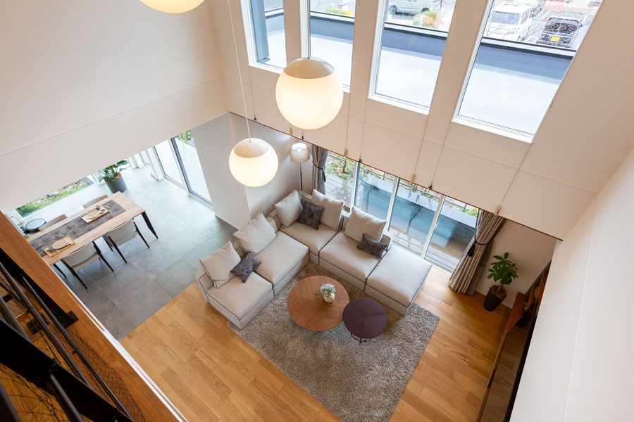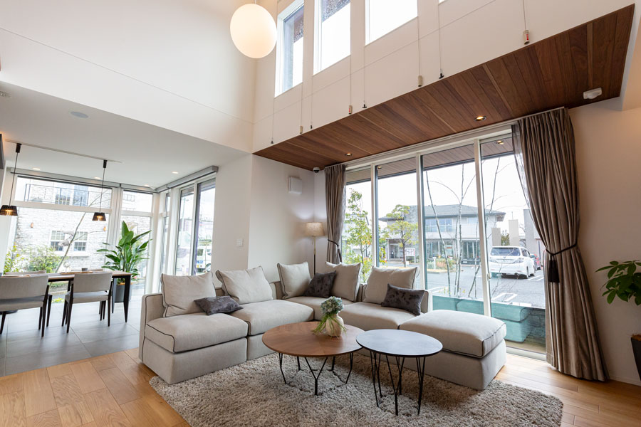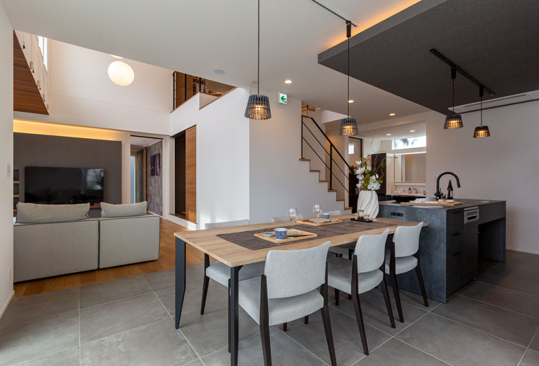 コーナー部分の大きな窓が印象的で洗練された外観。水平を強調するコートラインや木調の深い軒が、住まいに風格を与えます。ゆとりの広さと、吹抜けや階段を通じて伸びやかにつながる空間の中で、自然とご家族が集える住まいをご提案します。