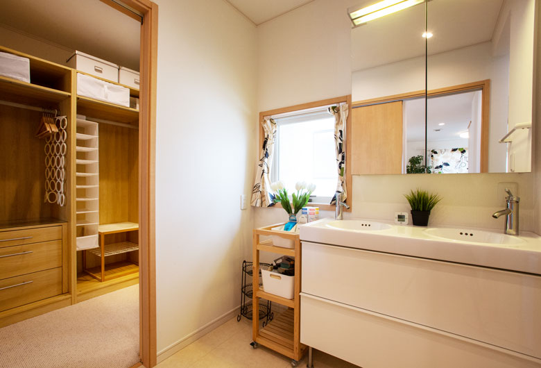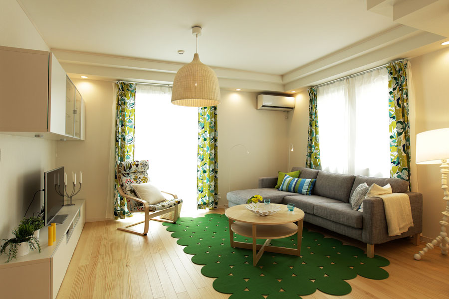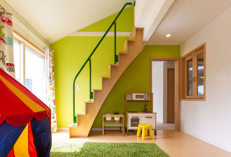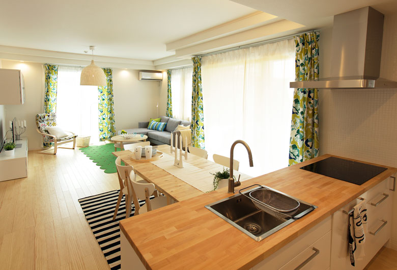 遊び心のあるすまい。イケアならではの北欧風を感じさせる外観をベースに、木下工務店だから実現できる自由設計のイケアハウスです。 素材の色を活かした無垢材のフローリングや建具を使用することで、木のぬくもりを感じられ配色が明るい仕上がりの展示場となっております。 子育て支援をコンセプトに「シューズクローク」や「おかえり手洗い」など動線や家事室など奥様目線の間取りに家の真ん中が吹き抜けた遊び心もある住まいになっております。