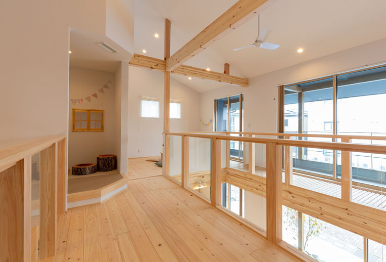 深い軒が落ち着きを感じさせる飽きのこない外観。玄関の引き戸を開けると、木の香とともに土間空間が広がります。大きな吹き抜けのあるリビングは、梁表しの開放的な仕上げ。中央にある小上がりは、食卓、書斎、だんらんの場として多目的に活躍します。ぐるっと回れる間取り、キッチン後ろの洗濯動線、子どもの好奇心をくすぐるヌック。暮らしのシーンをカタチにした間取りは、居心地のよさだけでなく、毎日の動線や収納まできちんと考えらています。国産ひのきの香りや足ざわりは、ぜひ展示場で体感してください。