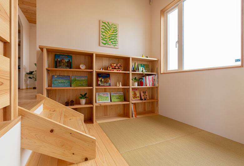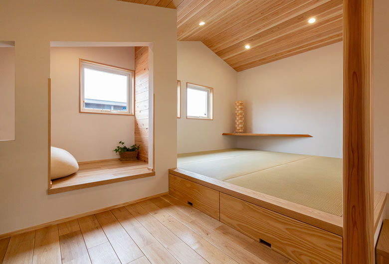 木と漆喰で仕上げたナチュラルスタイルの住まいです。勾配天井のリビングはダイナミックな吹抜けになっています。スキップフロアーによる小部屋スペースが何カ所も配置され、楽しい空間を演出しています。個性あるオリジナル造り付け家具は、愛着の増す住まいになり、長い軒のある瓦屋根は、自然の力を最大限生かしたパッシブ工法の造りになります。
