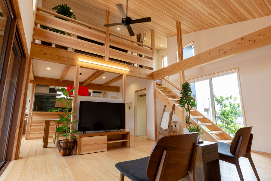 平屋+ロフトスペース+スキップフロアー。 ムク材・しっくい・自然素材・造作家具