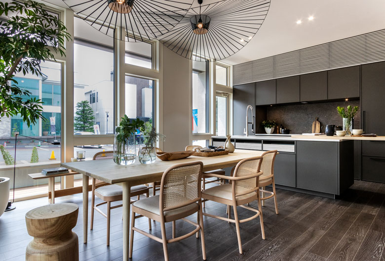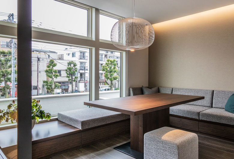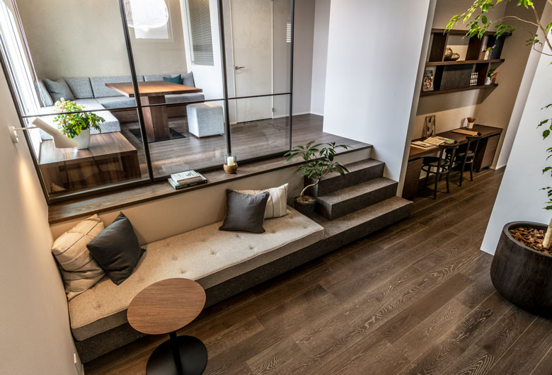 高窓・高天井の開放的なDK空間。ご家族との時間だけでなく周囲に開いたカフェや教室などパブリックな使い方を想定。間仕切り建具で可変性を持たせプライベートの両立が可能になっています。また、スキップフロアを活かし、連続した広がりのある空間構成です。