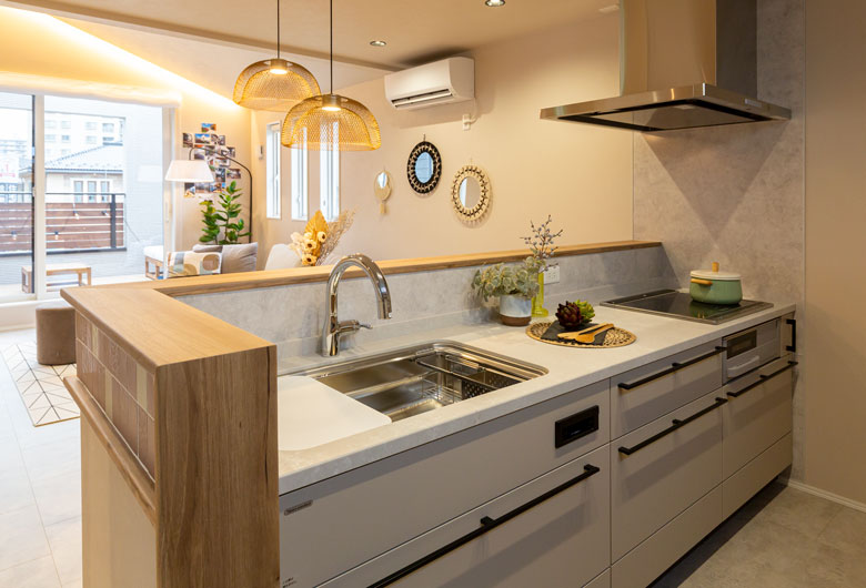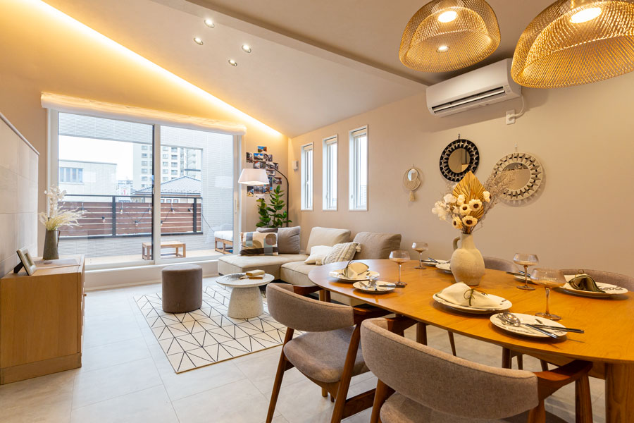 2階は「Lagom/ラーゴム゙=ちょうどいい」をテーマに、共働きのご家族を想定。2階LDKは19.1帖となっており、近年人気のグレージュ色と金属素材を組み合わせたお洒落で都会的な住空間に。日々の暮らしやすさを考えた“ちょうどいい暮らし”をご提案。