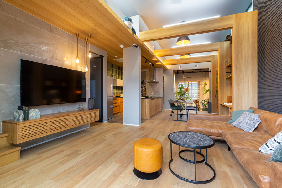 1階は「Mysig/ミーシグ=居心地のよい」をテーマに。24.7帖の1階LDKはダーク色の天井とライト色の無垢材で住空間にコントラストを取り入れ、自然素材に囲まれながら、くつろぎ時間を過ごせるカフェ空間に。開放感のある3.6mの天井がポイント。