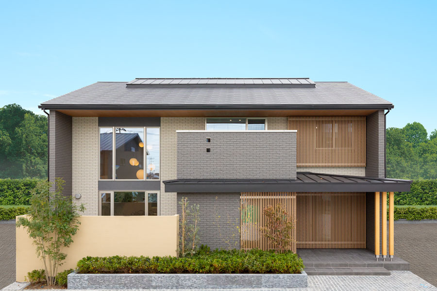 相模原展示場のコンセプトは「~愉しむ住まい~斬新さと懐かしさを愉しむ、ゆとりの心でくつろぐ暮らし」外観は軒の深い屋根と1階部分のゲートが水平ラインを強調しています。リビング前に配置した木調の格子が和の雰囲気を醸し出し、内と外を繋ぐ空間を形成しています。1階の1LDKは吹き抜けにより2階とつながる開放的な空間。玄関にはゆったりとした広さに収納力の高いファミリークローク。2階にはプライベートバルコニーと一体感のあるセカンドリビングを設け、家全体で家族が共に過ごす温かい時間が広がる家となっております。