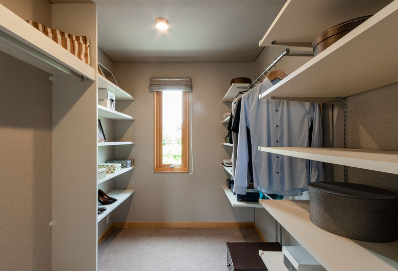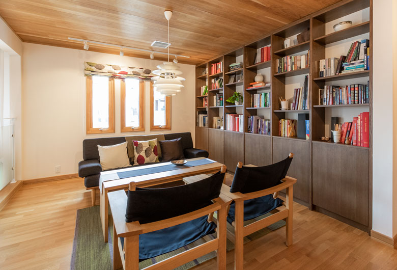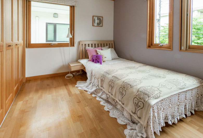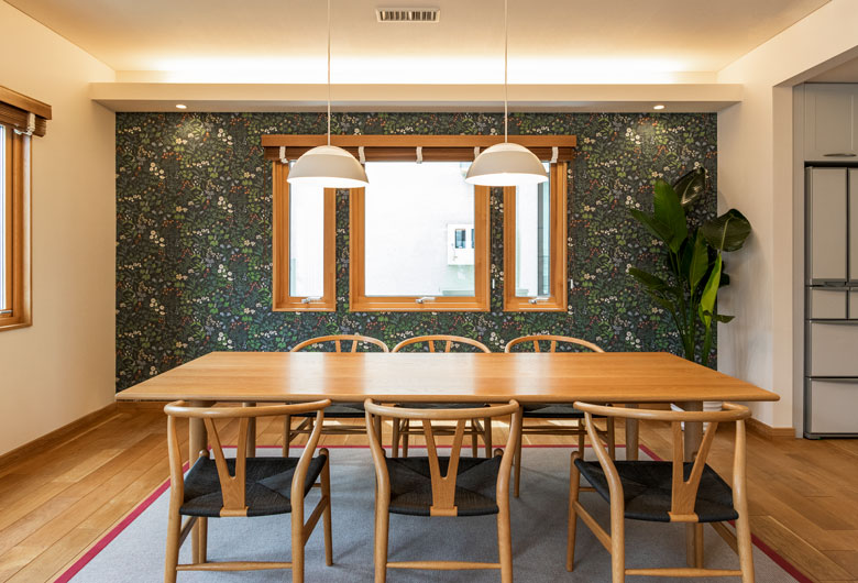 木枠の窓から見える緑と、木の香りが心地よい家。