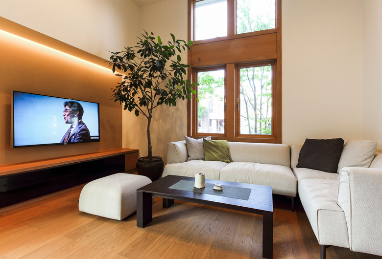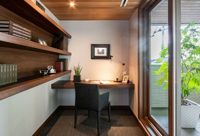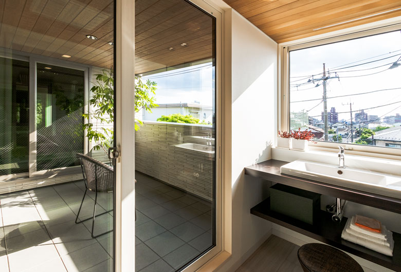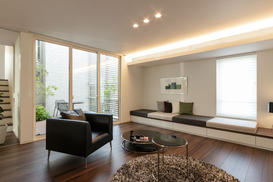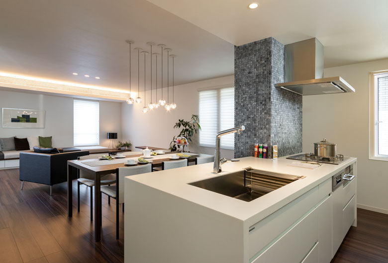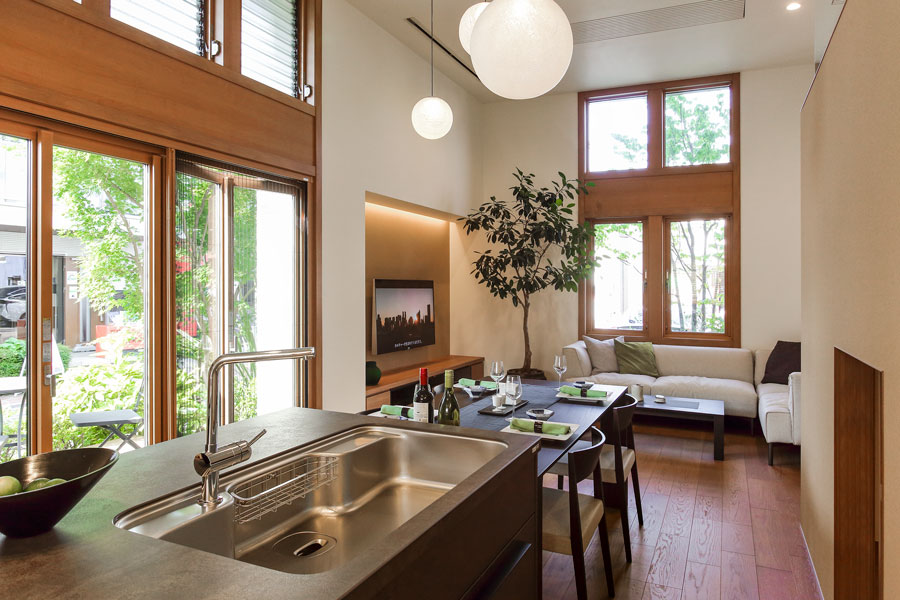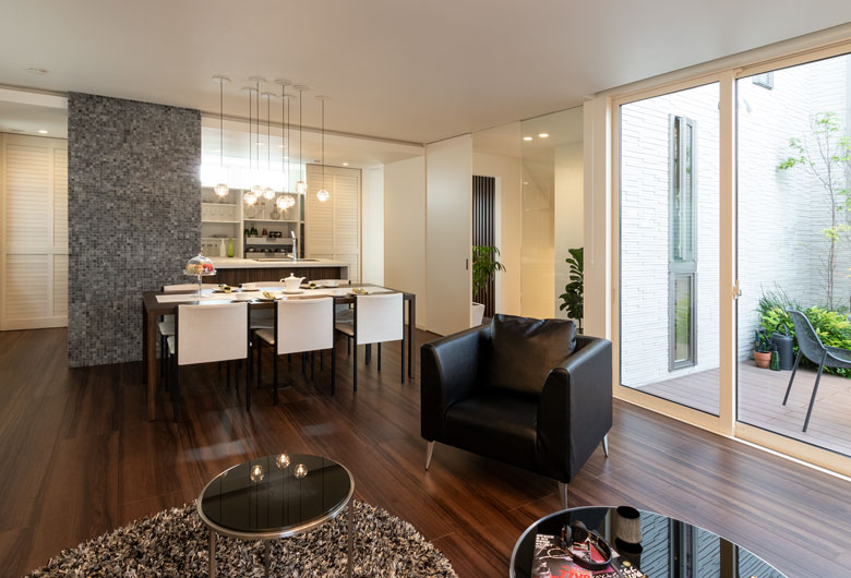 二世帯家族の自然な交流を意識しながらも、各人それぞれの居場所を確保した住まい。1、2階に大収納空間「蔵」を設け、スキップ階段を中心に各フロアを構成。都市の限られた敷地の中で最大限のゆとり空間を実現するミサワホームならではのタテとヨコの空間活用をご覧いただけます。各階異なるインテリアコンセプトでシンプルイズベストの中に深みのあるシーンを演出し、様々な表情をご覧いただけます。