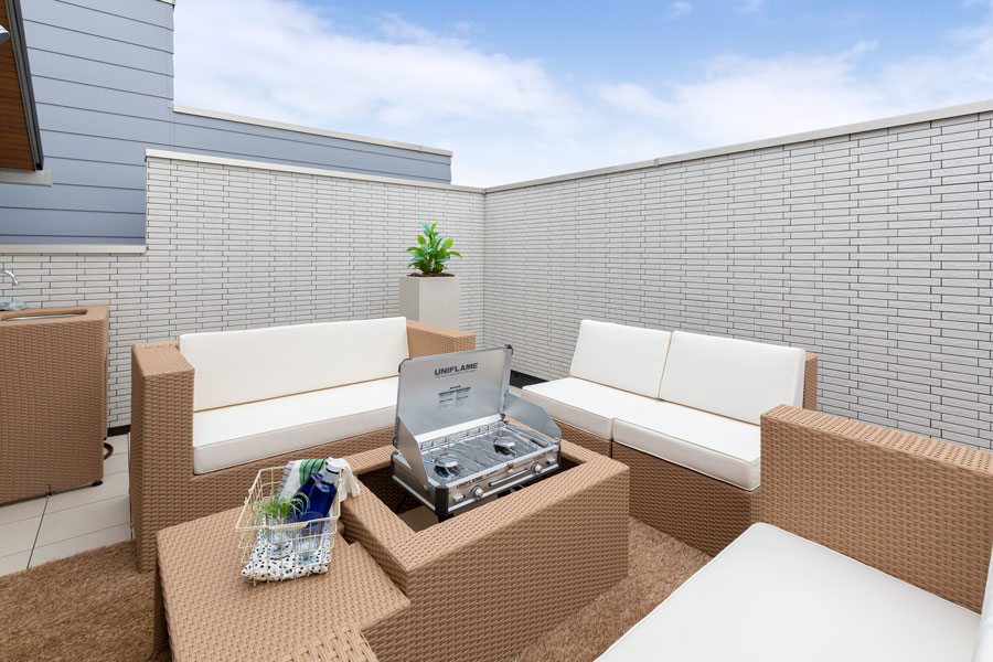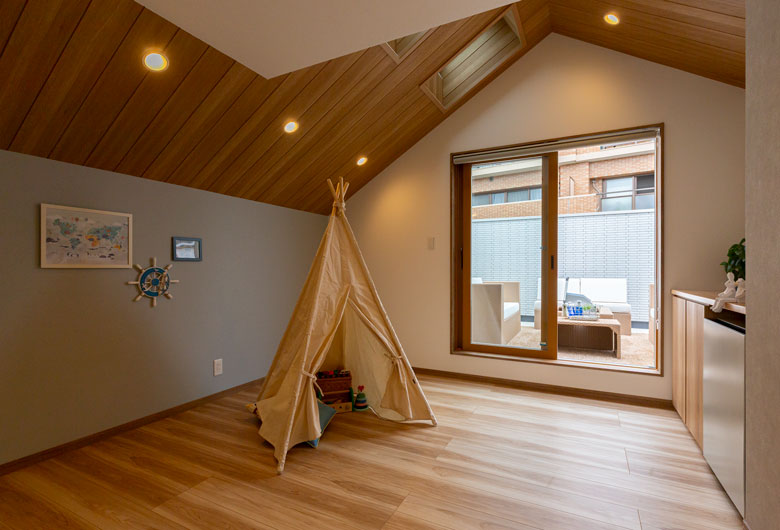 全館空調”Z空調”を搭載した、2世帯住宅。1階は親世帯の居室空間。2階、3階は子世帯の居室。2階リビングは3階へ続く屋根勾配を用いて開放感を演出。3階はアトリエ。子供部屋が秘密基地に。そして屋上庭園、青空リビング。太陽と青空を感じられるプライベート空間です。