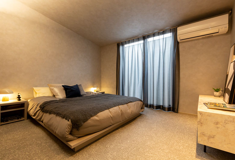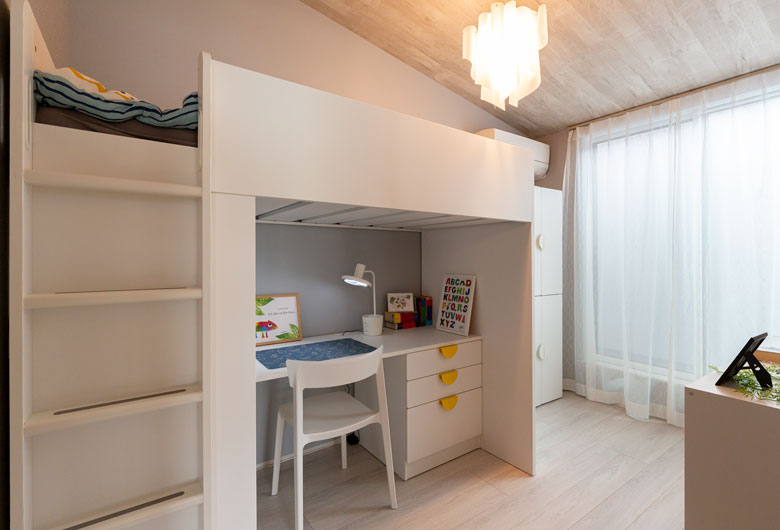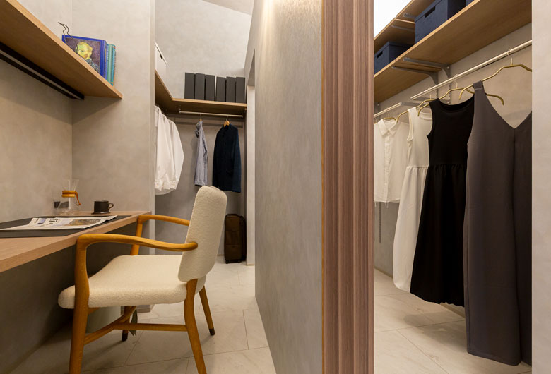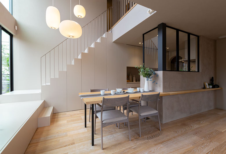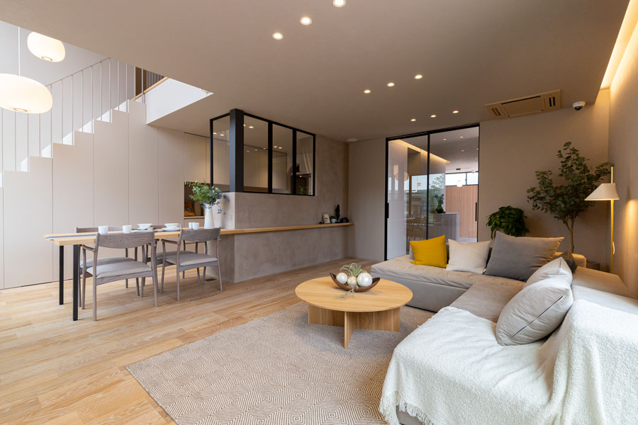グレーや木目を基調とした柔らかく落ち着いたコーディネートとしており、リビングやワークスペースに面した大きな窓やDK上部の吹抜けが明るく開放的な空間を演出しております。スムーズに家事が行えるよう、キッチンからランドリールーム、風呂、洗面といった水廻りは回遊できる同線計画になっております。また住宅設備機器や家電等をスマートフォンから遠隔操作できるIoTシステムも導入いたします。また、EV(電気自動車)向け屋外コンセントの標準装備をいち早く体感できます。