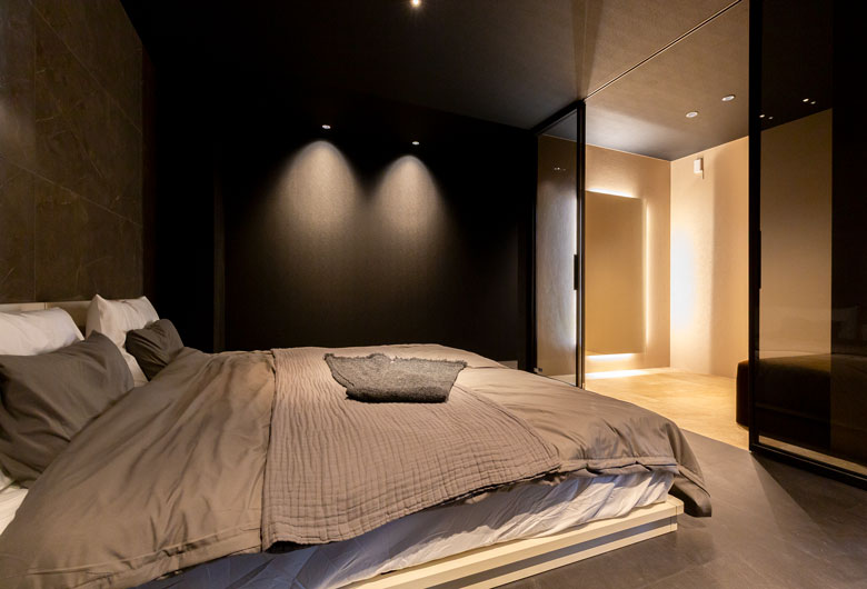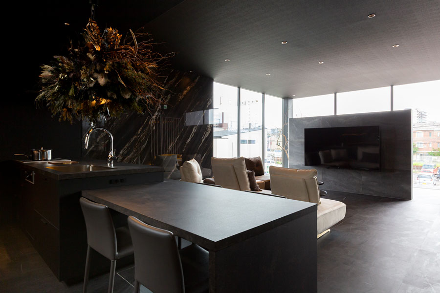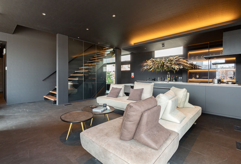 黒を基調とし重厚感のある空間と、SE構法ならではの大空間リビング、天井高2.7m、大開口が特徴的です。