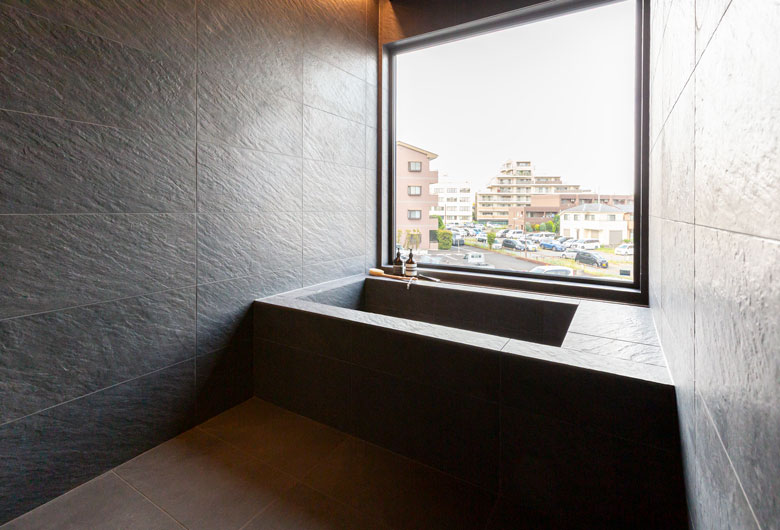 2階のモデルルームでは石や植栽、無垢材など自然の要素を取り入れたモダンデザイン。