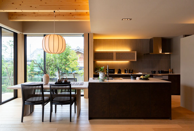 現代の暮らしを配慮した設計に、伝統的な組子や塗り壁、鉄を取り入れ、自然の変化とともに素材の変化をいつくしむ、モダンと和の融合した恒久的に親しめる住まいとなっております。