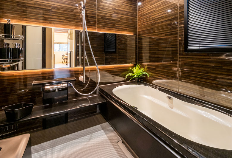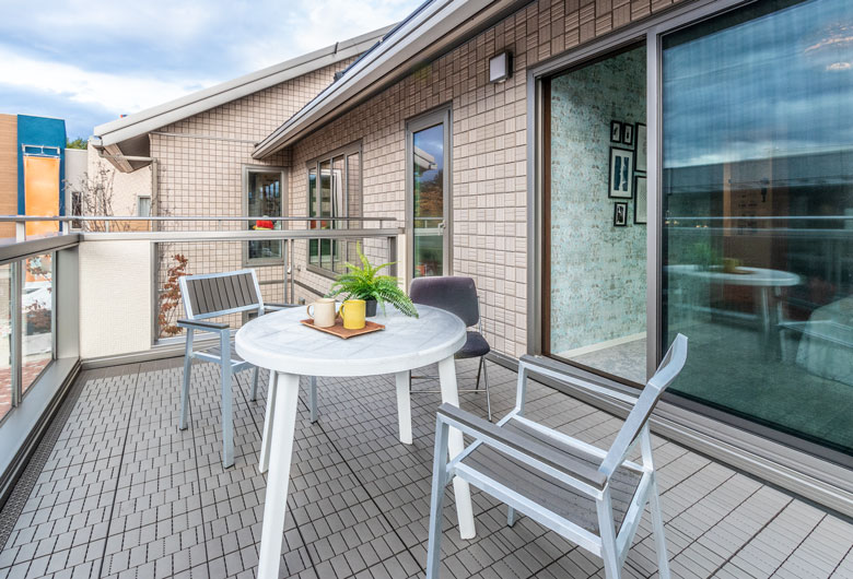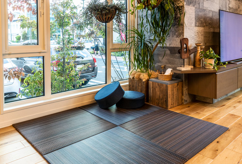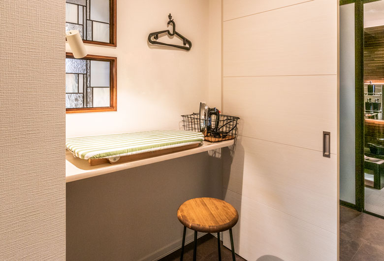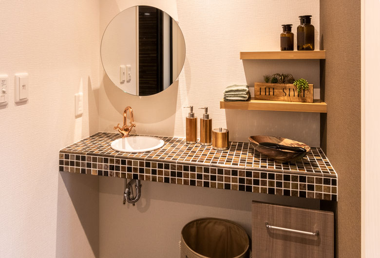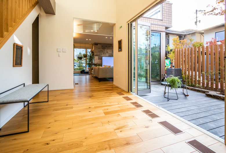 周辺の緑や空と美しく調和し、自然素材ならではの風合いを備えた磁器タイル外壁。傾斜屋根の悠然とした佇まいは、建物の存在感を際立たせるだけでなく小屋裏に「コンファティック」というプラスアルファの空間を生み出しました。「明日・・・ドマーニ」の名にふさわしく、未来へと続く確かな暮らしを物語ります。