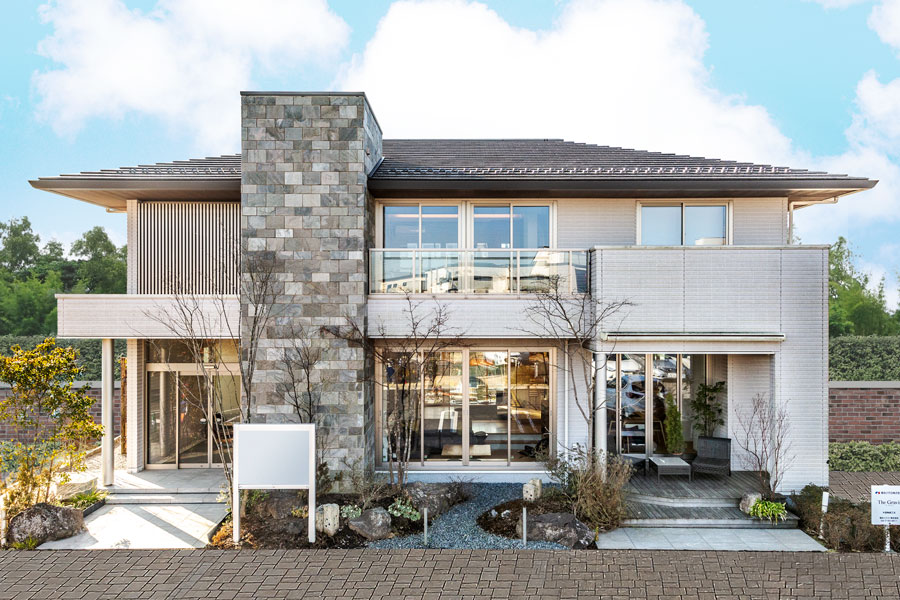 1階はナチュラルで和洋問わず調和する国産ナラ材使用、2階は世界三大銘木のひとつウォルナットを贅沢に使った三世代とペットが共に楽しめる二世帯プランです。住友林業ならではの木質感、ビッグフレーム構法が持つテクノロジーを取り入れ、強さと自由度を両立させました。『日本の文化』を受け継ぐ和室の技術、軒を深くしたシンプルなデザインに、バルコニーとデッキ3本の水平ラインを設けることでバランスの取れた木質感を演出しています。