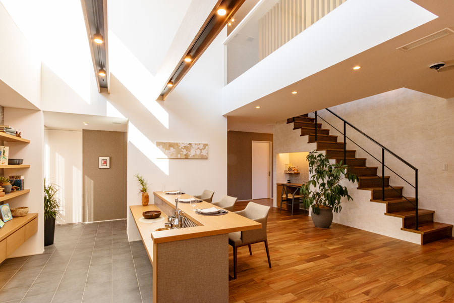30帖の無柱空間・大開口・吹抜けと高い耐震性能を両立。バランスの取れた住宅です。