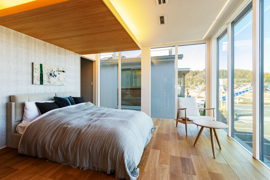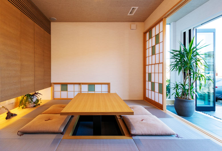 玄関には匠の技の組子障子でお出迎えします。36帖広々LDKにダウンフロアや吹抜けを取り入れた変化のある開放的な室内空間や、2階主寝室の11Mの連続開口から見下ろす風景はリゾート感満載です。室内は全館空調で1年中快適な室温をコントロールしています。是非ご体感下さい。また、太陽光発電とV2Hの連携でエコな住まい方をご提案しています。