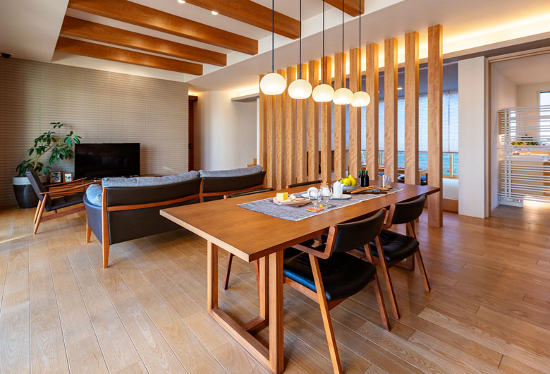 ・無垢の床材、木の列柱やあらわし構造材を用いて木の温もりを感じて頂けます。