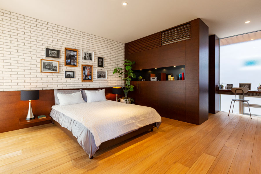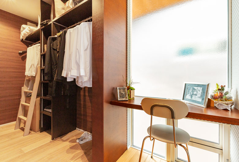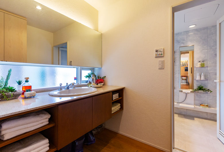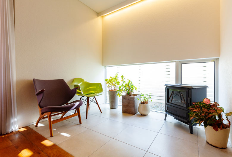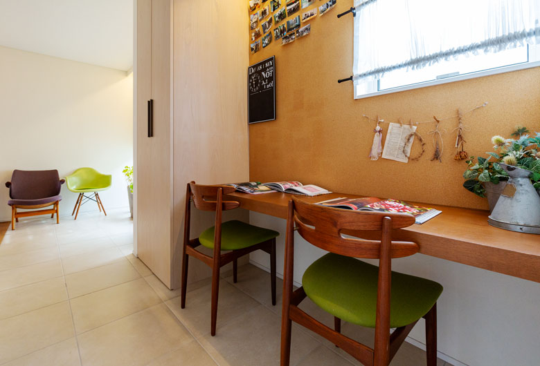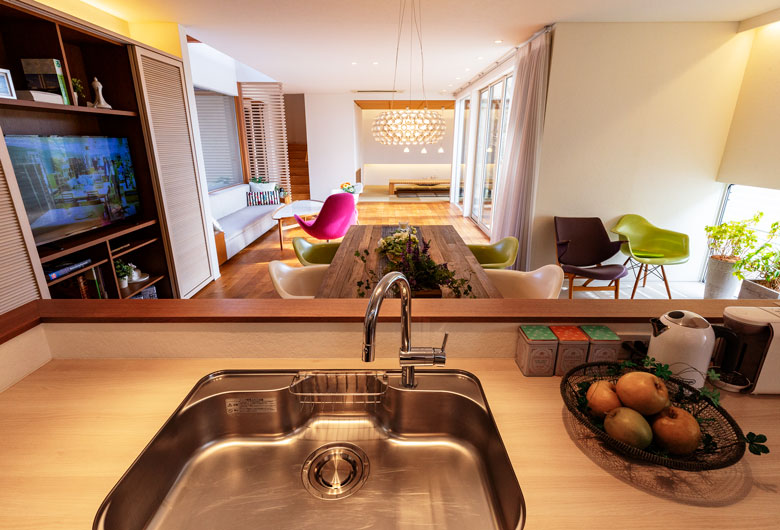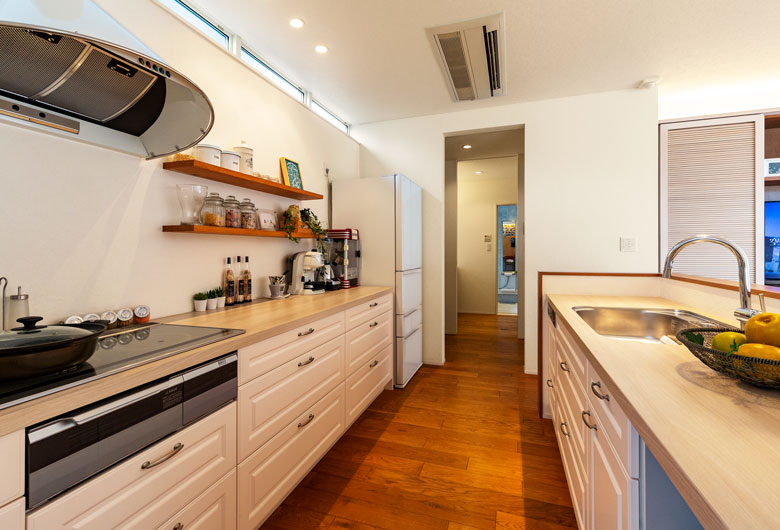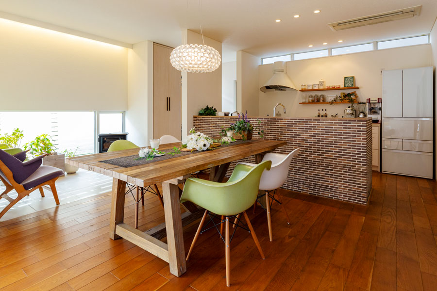 大切にしたのは家族がゆったりと過ごせる時間と暮らしやすさ。四季折々の自然を取り込む伸びやかなリビングから続くお洒落なカフェ風キッチン、掘り炬燵のある落ち着いた和室、2階には収納力たっぷりのオープンタイプのウォークインクローゼットと書斎コーナーがある主寝室。安らぎと機能性のポイントをあちらこちらにご用意しました。また内外に自然素材を用いることで暮らしの豊かさを演出し、年月を経て温もりがさらに増していくようなナチュラルで穏やかな暮らし心地がうれしい家族思いの住まいです。