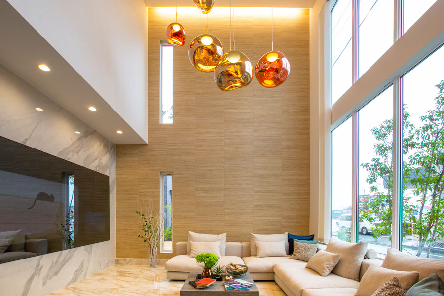 家の中心に中庭(パティオ)を配置し、プライバシーを確保しながらも多くの自然光を取り込む明るい空間を実現しました。全ての空間を中庭に面して配置することで、中庭越しに家族の気配を感じることができます。 また、リビングには高さ4.5m、幅2.5mを超える大開口の窓を設けました。天井高さ5.5mの吹抜と合わせて、これまでにない明るさと解放感をリビング空間にもたらしています。