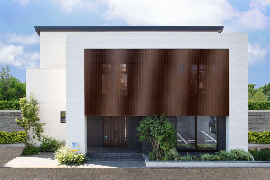 直線を活かしたフォルムと正面2階部分の縦格子が目を引く「秦野展示場」は、玄関ホールも外観のイメージを引継ぎ、格子状の壁がお出迎え。その先にあるLDKは、リビングのハーフ吹抜が開放感を漂わせます。また、リビングの一角を使ったスタディコーナーや、キッチン横のユーティリティ、ファミリークローク、勝手口近くのハーフ収納など、快適な暮らしをイメージできる提案がいっぱい。LDKを通らずに来客を通せるスキップ和室、小屋裏空間を活用したシアタールームも見どころです。