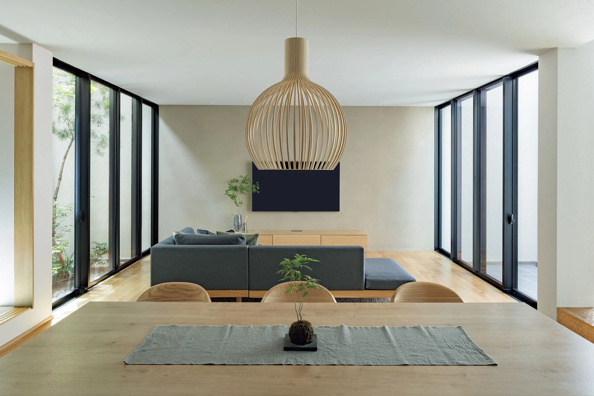 都市部のプライバシーを守りながらも、街並みに溶け込む緑を配したRC打ち放しの外構計画。臥梁と外壁タイル、アイアンゲートが特別感を醸成します。室内は「浜田山Terrace」White&Grayをテーマにアートオブジェクトにもなる家具や照明を合わせ、洗礼された落ち着きのある都会的な暮らしをご提案致します。「色」と「素材」を活かした、上質で優雅な「休日を楽しむための都市型空間」です。人が集う開放感溢れるLDKやホテルのスイートルームを彷彿させる寝室の新しい浜田山Styleをご体感下さい。