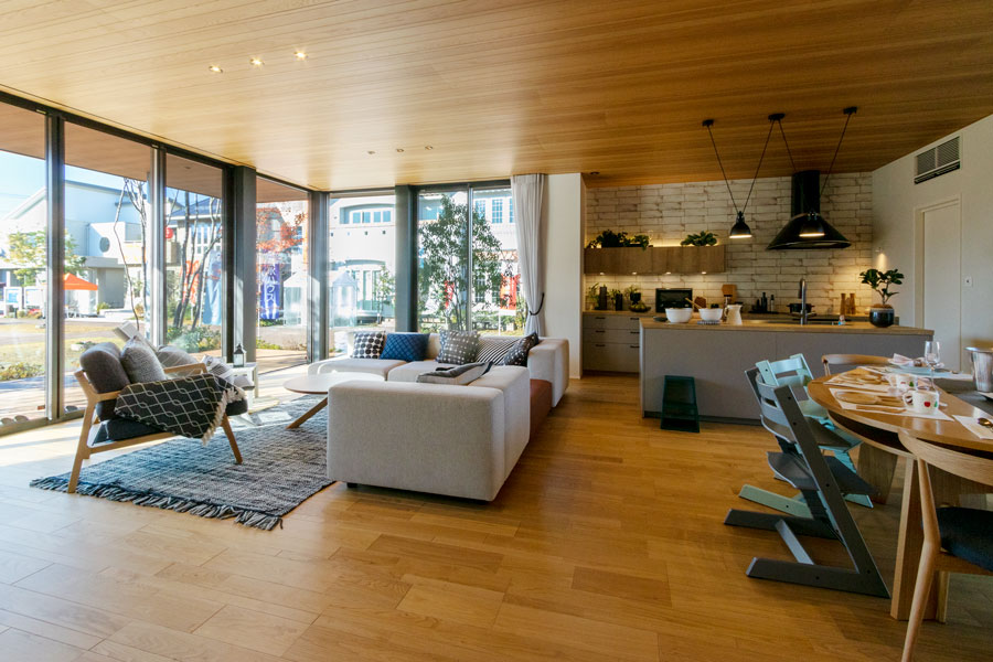 30代共働き夫婦と2人の子供の4人住まいを想定しています。コロナ禍で家族と過ごす時間が増え、家族が集まる空間に「居心地の良さ」をどうしたら感じられるか本気で考えてみました。自然と家族が集まる場所、子供たちと一緒に過ごす幸せ。そんな体験ができるのが建物のポイントです。その他、感染予防対策をしてある床材、タイル材、手すりなどの資材を利用したり、居間に入る前に手洗いすることも配慮しているのも特徴です。集いの空間の秘密を是非体験にお越しください。