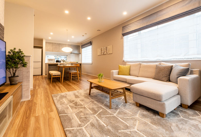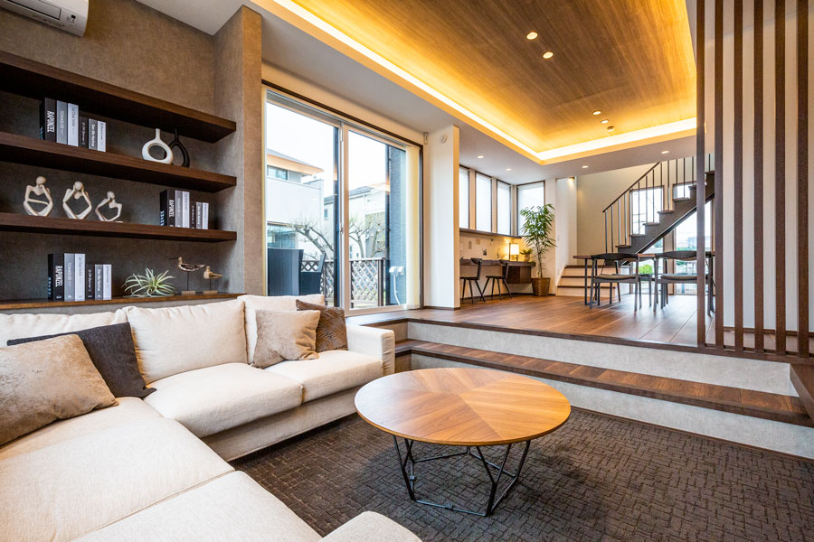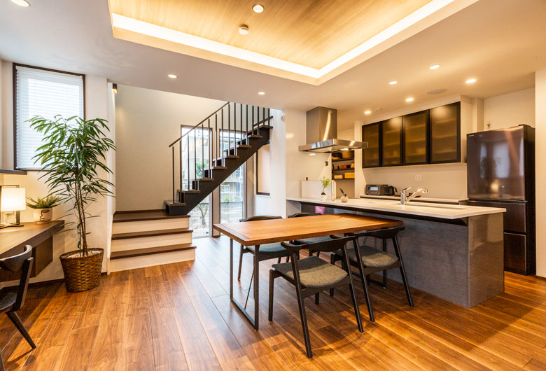 ダイニングからつながるリビングはダウンフロアを採用し大空間を演出しています。またキッチン裏に洗面スペースを設け、水まわりをまとめた家事動線や、パントリー・小屋裏収納などの豊富な収納スペースも魅力です。