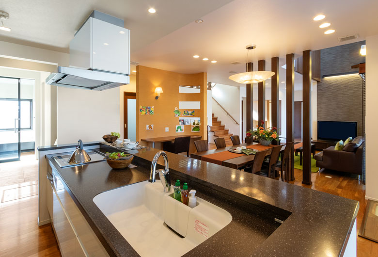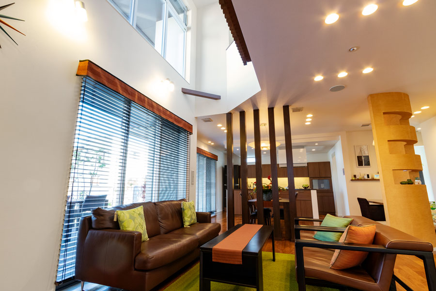 和モダンの広々としたキッチンからリビングへ繋がる空間は約30帖。リビングの天井は吹き抜けで、柔らかな日差しが差し込む窓も設置。常に明るくゆったりとできる大空間。スキップフロアはリモートワークに最適な場所に。建物全体が全館空調で室温を保ち、高い省エネ性も実現。毎日の家事も負担にならない様に、家事動線を一直線にし、時短を叶えます。家族みんなが心地良く、どこに居ても家族の気配を感じられる「つながる家」をご体感下さい。