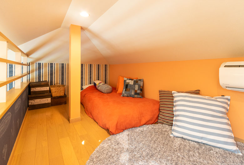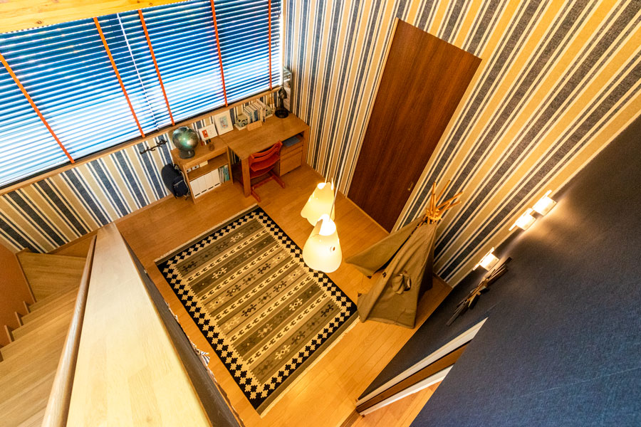 ■間取■ 「二世帯同居型」の1階LDKには大きな吹き抜け、家事スペース(テレワークスペース)、隠れパントリー、を設計。2階のプライベートルームのロフトは、固定階段で昇り降りする事ができます。内装は世界三大銘木の『チーク』で樹種コーディネートされた木質空間です。