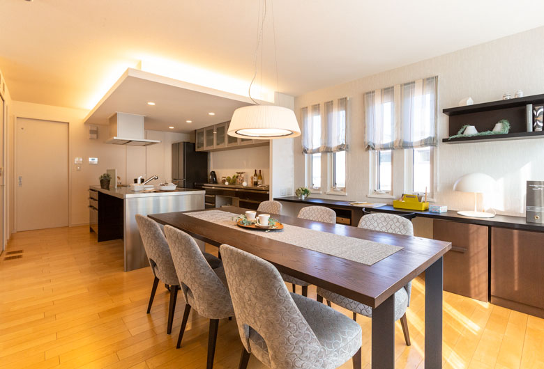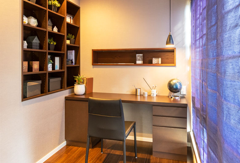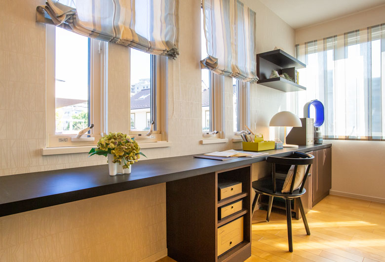 太陽光・蓄電池を搭載した災害に強いレジリエンス二世帯住宅です。陽当たりの良いカフェスペースやジムコーナー、書斎など暮らしを豊かにする「プラスα」の空間提案。自分の為の時間を過ごす中でも、お互いの気配を感じることができる工夫を凝らした設計で、豊かな3階建て二世帯住宅を実現しています。