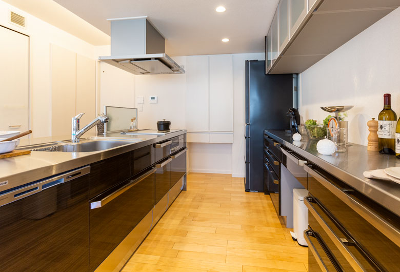 1階の親世帯は車椅子生活を想定した外構計画と室内環境、2・3階の子世帯は共働きのご夫婦を想定した家事動線やオープンプランの開放的で家族のつながりを感じられる空間となっています。